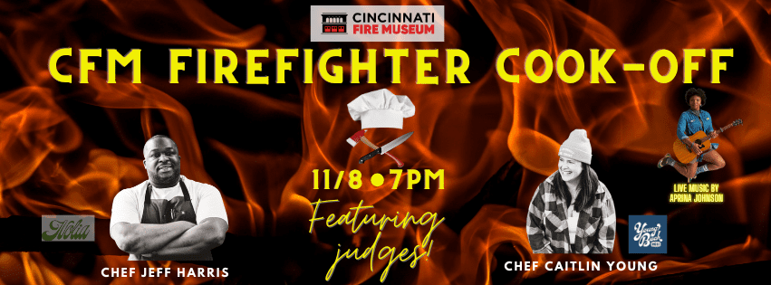 The Cincinnati Fire Museum is hosting our fifth annual firefighter cook-off as a fundraiser on Saturday, November 8 at 7 p.m. Local firefighters will compete to win the title of Best Firefighter Chef judged by an esteemed panel, which this year includes James Beard nominated Chef Jeff Harris of Nolia and Top Chef Contestant and owner of Young Buck Deli, Chef Caitlin Young.